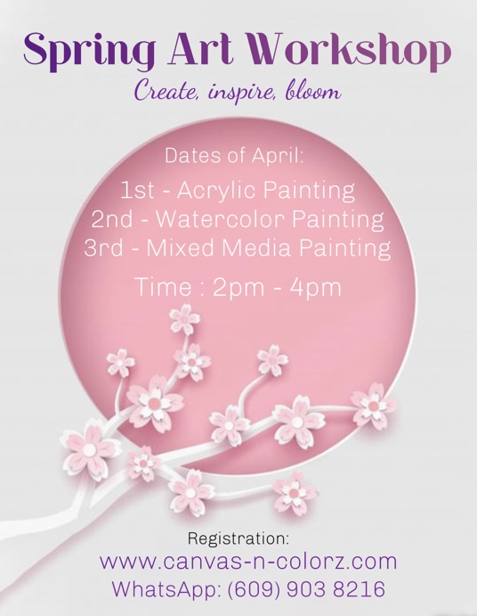 You can do all three or just one! No experience needed โ just bring your imagination and let your creativity shine! I'll provide all the materials, guidance, and inspiration. Let's create something beautiful together! April 1st - Acrylic Painting: ^^^^^^^^^^^^^^^^^^^ In this workshop we'll be creating a stunning Acrylic Painting - 'Blossom'. Canvas Size : 12โX16โ Let's capture the beauty of spring flowers on canvas, exploring colors, textures, and techniques. Can't wait to see your masterpiece!" April 2nd - Watercolors Painting; ^^^^^^^^^^^^^^^^^^^^^^ Spring into color! In our Watercolor Painting session, we'll play with washes, blends, and textures to create dreamy spring landscapes. Let the watercolors flow and your creativity bloom! April 3rd - Mixed Media Painting: ^^^^^^^^^^^^^^^^^^^^^^^^ Get messy and create magic! ๐ธ In our Mixed Media Painting workshop, we'll experiment with textures, patterns, and techniques using a variety of tools and materials. Think paint, paper, fabric, and more โ all coming together to create a unique spring masterpiece! Hope to see you there! ๐